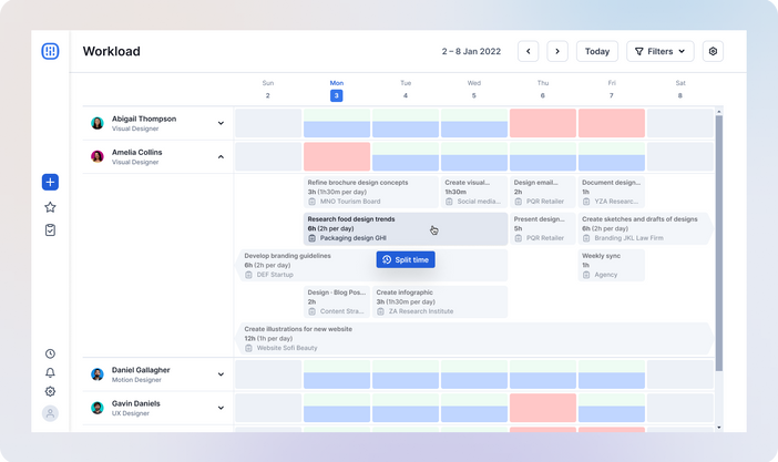 Although users were able to understand the visual charts and the design worked the way they expected it to, they initially confused task names with project names and misunderstood the red bar as a fully booked day.